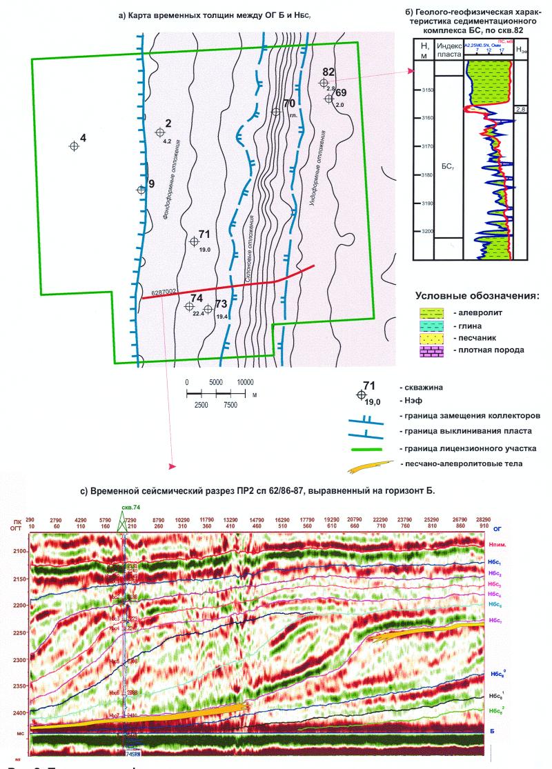 Для пласта БС2 шельфового генезиса западной границей замещения коллекторов принята линия бровки палеошельфа по значению изохоры 230 мс. Согласно скважинным данным, вскрывшим отложения седиментационного комплекса в зоне ундатемы, коллекторы выделяются только в скв.71 и 74, расположенных параллельно бровке палеошельфа. Значения эффективных толщин в этих скважинах составляют 9.6 и 8.0 м, соответственно. Средневзвешенные значения пористости колеблются от 15 до 16.5%, что существенно отличается от общего фона значений коэффициентов пористости в пластах группы БС для этой территории.