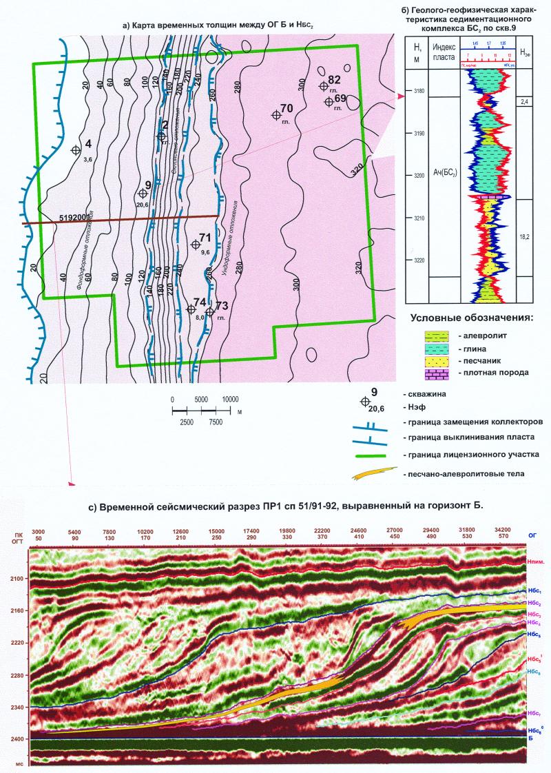 Рассматриваемая часть разреза осадочного чехла, на временных разрезах ограниченная снизу ОГ «Б» (кровля баженовской свиты – J3-K1b-v), сверху – Нпим (пимская глинистая пачка – K1g), имеет клиноформное строение и здесь предполагаются литологически ограниченные резервуары.