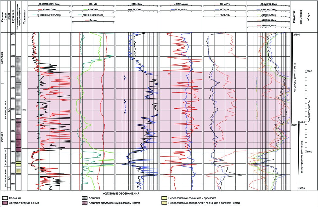 Породы баженовской свиты характеризуются высокой битуминозностью, развитие которой связывают с постепенным вытеснением внутрипоровых вод образующейся из органического вещества нефтью. Поровое пространство продуктивных пород баженовской свиты в основном заполнено нефтью, содержание связанной воды в поровом пространстве незначительно и для большинства пород близко, в среднем, к 10%. Поверхность капилляров чаще всего гидрофобная. Всё это обусловливает очень высокие удельные электрические сопротивления (рис.2).