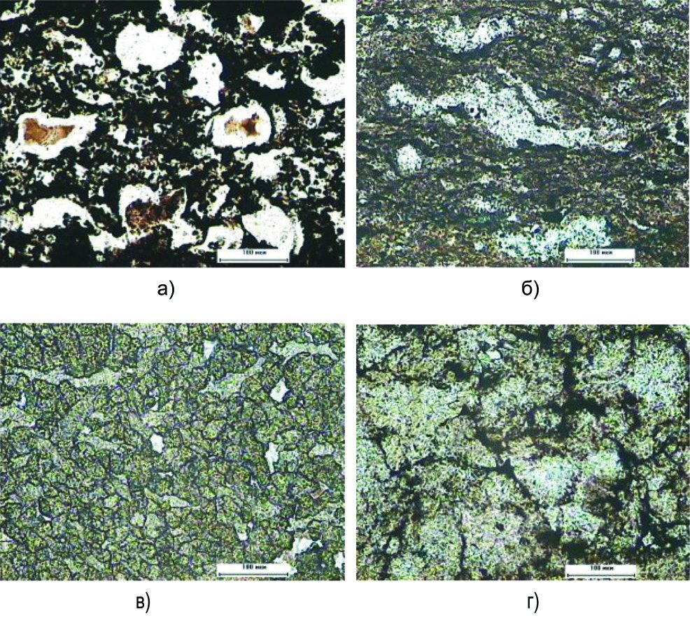 Рис.3. Фотографии петрографических шлифов пород пласта ЮК0, снятых в проходящем свете, отобранных из: а, б – скважины 1195 (интервал отбора 2326 – 2333 м); в, г – скважины 1193 (интервал отбора 2369-2377 м) Красноленинского месторождения (М.Ю. Зубков)