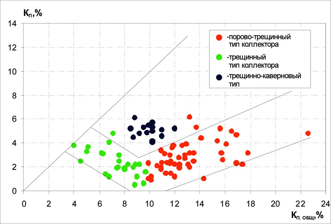 В области Кп,общ≤10% доминируют коллекторы трещинного и трещинно-кавернозного типа, для которых отсутствует связь величин Кп,общ и Кп, наблюдающаяся для коллекторов порово-трещинного типа, и которые обеспечивают наиболее высокие притоки нефти в скважины. Улучшение коллекторских свойств пород в области Кп,общ>10% происходит при величинах Кп>3.5÷4% за счёт увеличения в порово-трещинных коллекторах количества более раскрытых трещин и вторичных пустот.
