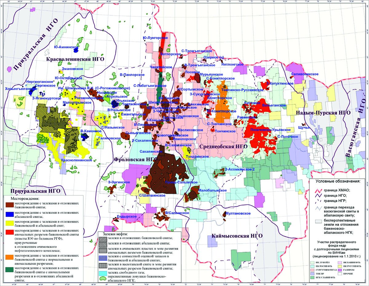 В результате проведенных в ГП «НАЦ РН им. В.И. Шпильмана» исследований все рассматриваемые 172 залежи были разнесены по конкретным нефтегазоносным комплексам, а залежи, расположенные в западной части округа (в геологическом отношении к западу от границы перехода нижневасюганской подсвиты в абалакскую свиту), по принадлежности к свитам – абалакской и баженовской.
