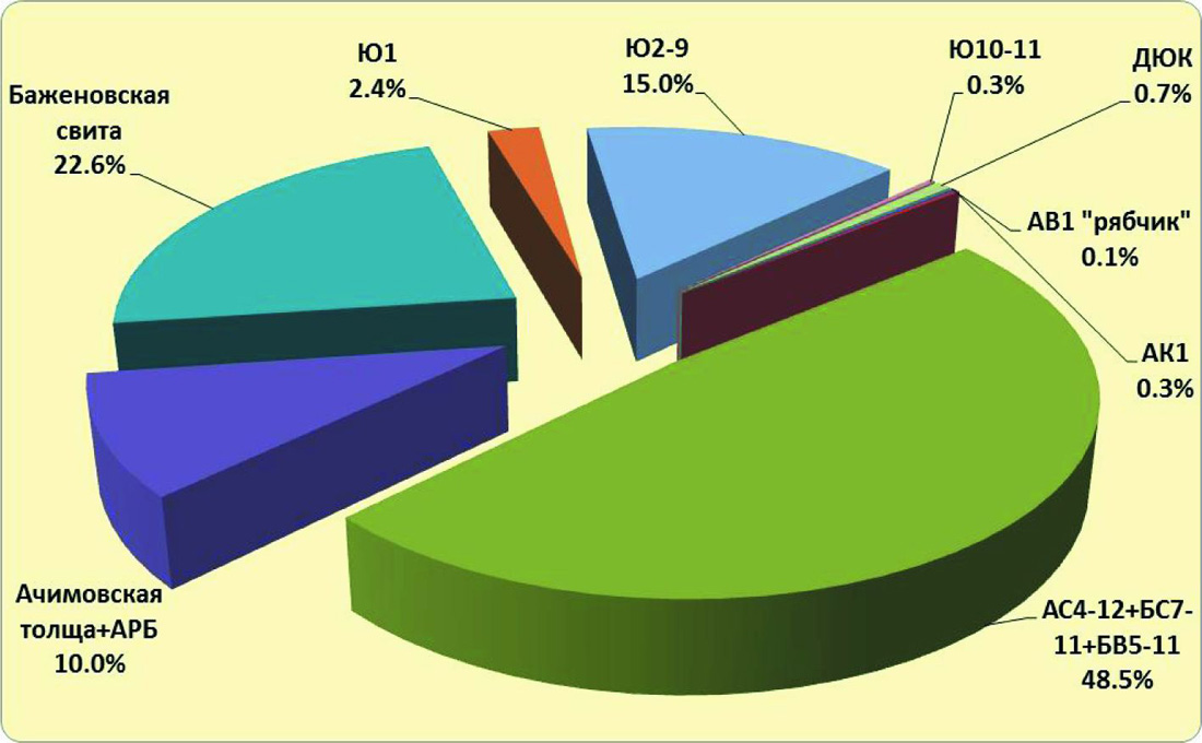 По литолого-фациальному и стратиграфическому признаку залежи ТрИЗ дифференцированы по девяти группам пластов, около половины суммарных трудноизвлекаемых запасов категорий АВС1+С2 сосредоточено в группе пластов АС4-12, БС7-11, БВ5-11 (48.5%), 22.6% и 15% – в отложениях баженовской и тюменской свит (рис.2).