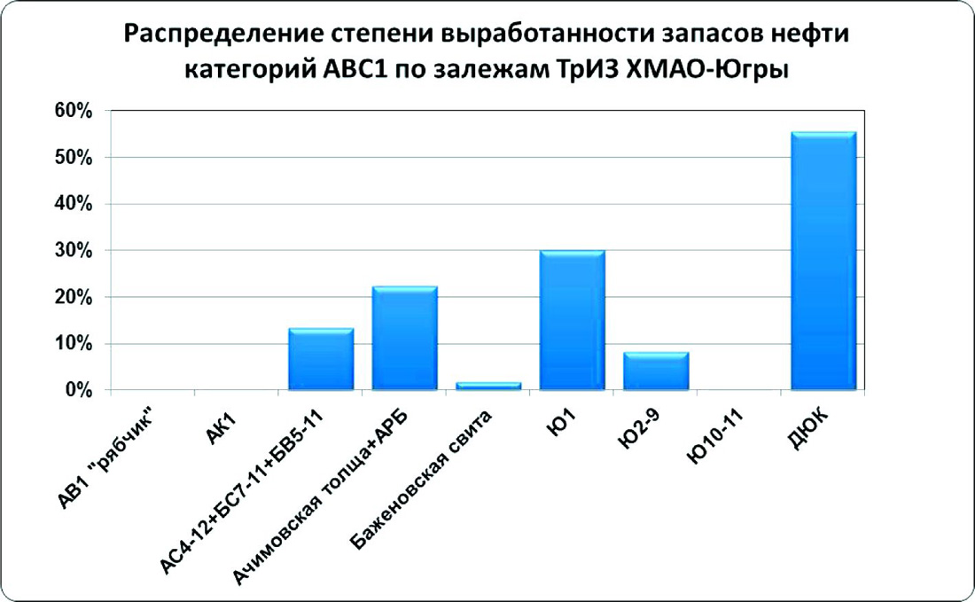 Степень выработки запасов в категориях ТрИЗ по пластам невысока (2-13%) за исключением отложений ДЮК (56%), пластов горизонта Ю1 (30%) и отложений ачимовской толщи (22%) (рис.3).