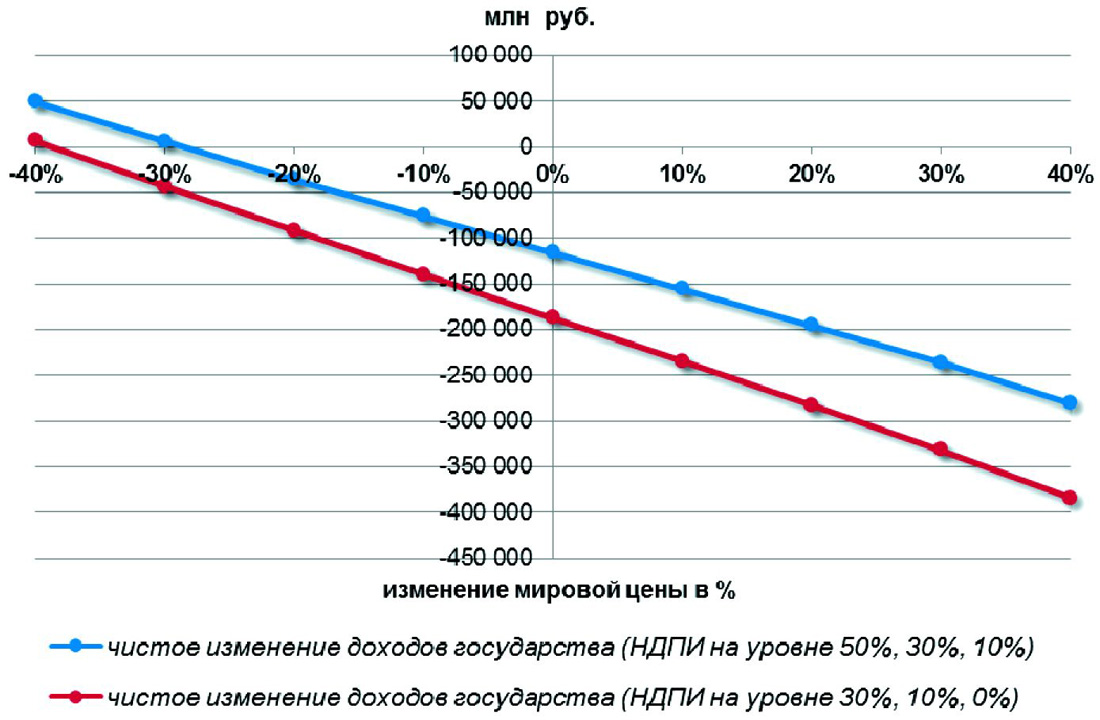 Рис.6. Зависимость чистого изменения доходов государства от мировой цены на нефть