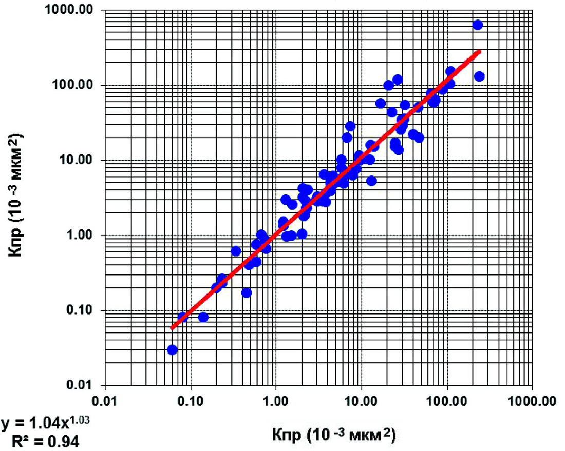 Рис.7. Сопоставление основных и повторных замеров проницаемости на образцах керна