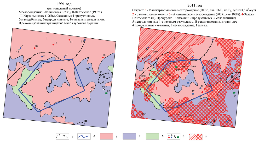 Рис. 5. Проверка временем регионального космофотонефтепрогнозирования Шаимского нефтедобывающего района (площадь 1 – Южно-Ловинская). 1 – «Старые» месторождения. 2 – Рекомендованная (1991г.) автором прогноза площадь нефтепоисковых работ. 3-5 – Космофотоземли: нефтеперспективные (3), бесперспективные (4), с неясной перспективностью (5). 6 – Скважины: продуктивные (а), непродуктивные (б), малодебитные (в), с неясным результатом (г). 7 – «Новые» месторождения и залежи.
