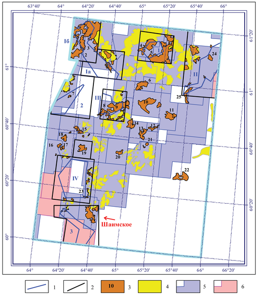 Рис.6. Участки проверки космофоторекомендаций 1991 года, месторождения и лицензионные участки (на 2011 год) Шаимского нефтедобывающего района. Границы проверок космофоторекомендаций: 1 – рекомендованные в 1991 году, 2 – фактические. Месторождения: 3 – «новые», открытые после космофотонефтепрогнозирования, 4 – «старые». Лицензионные участки: 5 – геологического изучения, разведки и добычи, 6 – геологического изучения. Участки проверки: Iа – Тултьяхский, Iб – Малошушминский, II – Корсунско-Потанайский, III – Мансингъянский, IV – Окуневский, 1- Южно-Ловинская пл., 2 – Восточно-Даниловская пл., 3 – Южно-Трехозерная пл. Список «новых» месторождений (выделены открытые на участках проверки космофоторекомендаций): 1 – Северо-Шушминское, 2 – Малошушминское, 3- Южно-Шушминское, 4 – Амыньинское, 5 – Малокартопьинское, 6 – Урайское, 7 – Южно-Даниловское, 8 – Южно-Мансингъянское, 9 – Мансингъянское, 10 – Лумутинское, 11 – Каюмовское, 12 – Северо-Семивидовское, 13 – Западно-Семивидовское, 14 – Южно-Валовое, 15 – Западно-Славинское, 16 – Хултурское, 17 – Малочанчарское, 18 – Турское, 19 – Андреевское, 20 – Польемское, 21 – Северо-Толумское, 22 – Восточно-Толумское, 23 – Маломортымьинское, 24 – Северо-Корсунское, 25 – Южно-Оханское.