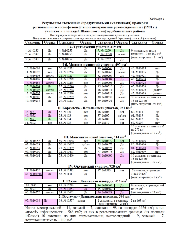 В таблицу результатов «точечной» проверки заносились следующие оценки: «Да» — полное подтверждение нефтепрогноза, когда скважина оказывалась в перспективной КФА; «да/нет» — подтверждение/неподтверждение, если скважина попадала на контур такой аномалии; «нет» — полное неподтверждение (скважина вне перспективных космофотоземель); «не ясно» — скважина в КФА, интерпретируемой неуверенно (табл.1).