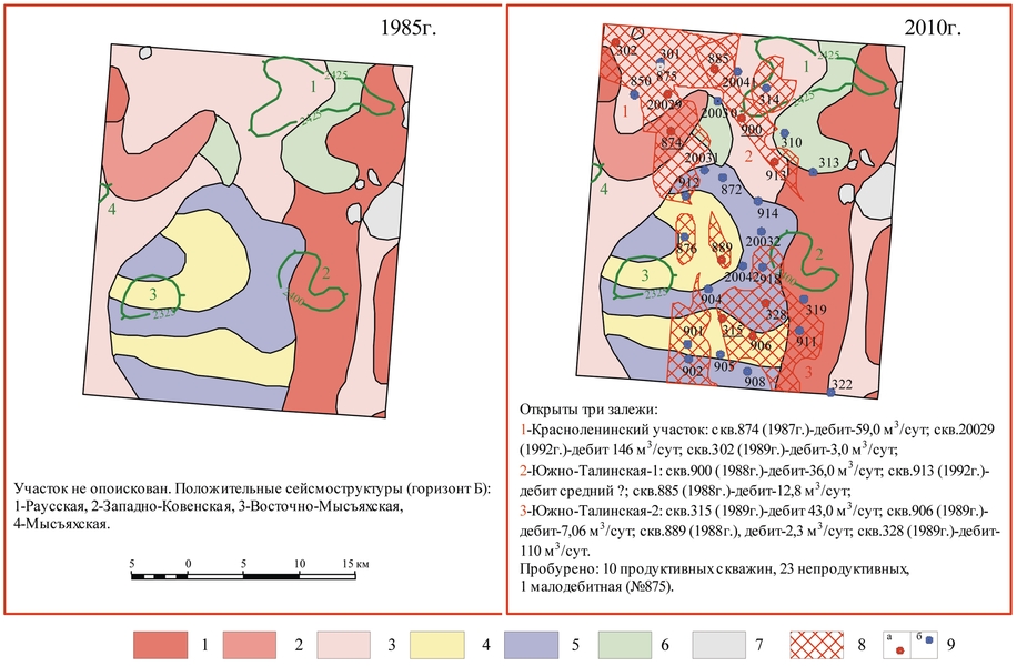 В 1987 году здесь были пробурены три скважины (Красноленинская площадь скв.850, 874,875). И лишь второй поисковой скважиной открыта промышленная залежь нефти: скв.874 с дебитом 59 м3/сут оказалась в контуре земель, прогнозируемых ранее высокопродуктивными. Два открытия на Южно-Талинской площади (скв.900 и 889) подтвердили космофотонефтепрогноз продуктивности в местах еще не пробуренных скважин. Всего на Раусском участке пробурено 10 продуктивных скважин; только одна (скв.328) не подтвердила дистанционный прогноз оказалась в бесперспективных космофотоземлях (рис. 1).