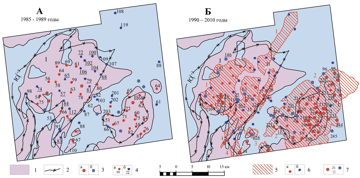 1 — Космофотоаномалии (КФА), отображающие предположительно нефтеносные земли (выявлены А.Л.Клоповым в 1984 году) 2 — Предполагаемый традиционным способом (В.Г.Елисеев, 1985) контур нефтеносности. 3 — Скважины, пробуренные до выявления КФА (на рис.А без номеров)Ж четыре продуктивные (а) и нерезультативные (б); подчеркнуты номера скважин, не неподтвердивших интерпретацию КФА. 5-7 — Информация, проверяющая (2010 г.) космофотонефтепрогноз 1984 года: 5 — месторождения «старые» — 1 — Бахиловское (1983г.) и 2 — Верхнеколикъеганское (1981);»новые» — 3 — Сусликовское (1994г.), 4 — Митрофановское (1999г.). 6-скважины (а-продуктивные, б-непродуктивные), пробуренные в 1985-1989 гг. (без номеров). 7 — Скважины 1990-2010 гг.: продуктивные — 40, непродуктивные — 14, малодебитные — 5