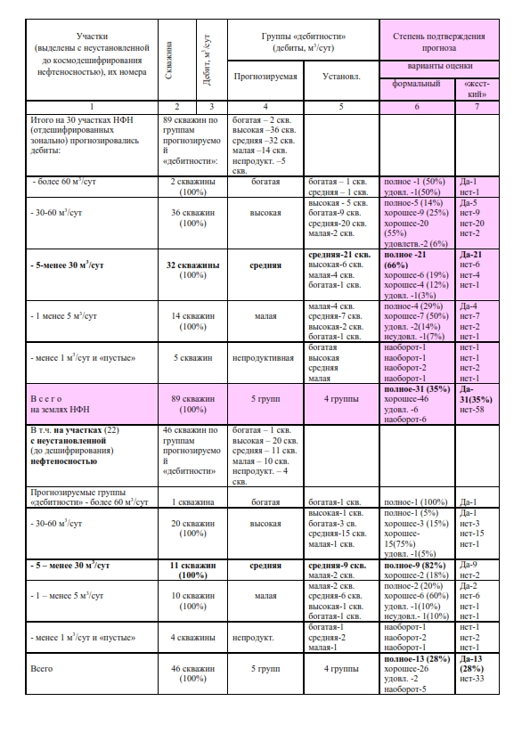 Для каждой из 89 продуктивных скважин(в число оценок не вошло 7 скважин, оказавшихся в природных помехах дешифрированию) в табл. 1 выносили результаты испытаний на приток, при этом брали максимальные значения без учета нефтепродуктивного пласта и других показателей испытаний. По этим значениям определялась установленная (фактическая) группа «дебитности». Последняя сравнивалась с прогнозируемой. Оценивалась степень совпадения установленной и ожидаемой групп. Таким образом, «технология» проверки осталась такой же, как в 1985 году [2].