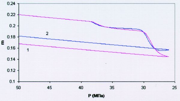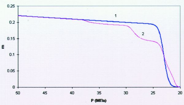 Добавление касательных напряжений усложняет деформационную картину, так как к пластическому сжатию добавляется также процесс дилатансионного разуплотнения, обусловленный развитием системы трещин. Трещины развиваются из имевшихся ранее зародышей, а также образуются в окрестности пор при их пластическом сжатии. Наглядно объяснить последнее можно, если представить, что затекание пустот происходит не просто с уменьшением их среднего диаметра, а имеет смысл, скорее, разрушения на соответствующем уровне. То есть неоднородность материала скелета и цемента, неидеальная форма дефекта приводят к появлению локальных касательных напряжений (даже в условиях равномерного всестороннего сжатия) и как следствие этого – обрушению стенок поры с образованием трещины. Размер зародившейся таким образом трещины имеет порядок диаметра породившей ее поры. На рис. 3 показана деформация пористой среды, вызванная отбором жидкости в условиях неравномерного сжатия. Линия 1 характеризует деформацию при боковом давлении 40 МПа, линия 2 – при 25 МПа. Стадия упругого и начало пластического деформирования в обоих случаях проходят одинаково. Однако после первого этапа линия 2 проходит выше линии 1, что связано с образованием и раскрытием трещин. И наконец, видно, что после упругой разгрузки величина остаточной пористости во втором случае выше, чем в первом. Более высокое касательное напряжение, зависящее от разности вертикального и бокового давления, приводит к увеличению скорости роста трещин (7), а также к увеличению их раскрытости (9).